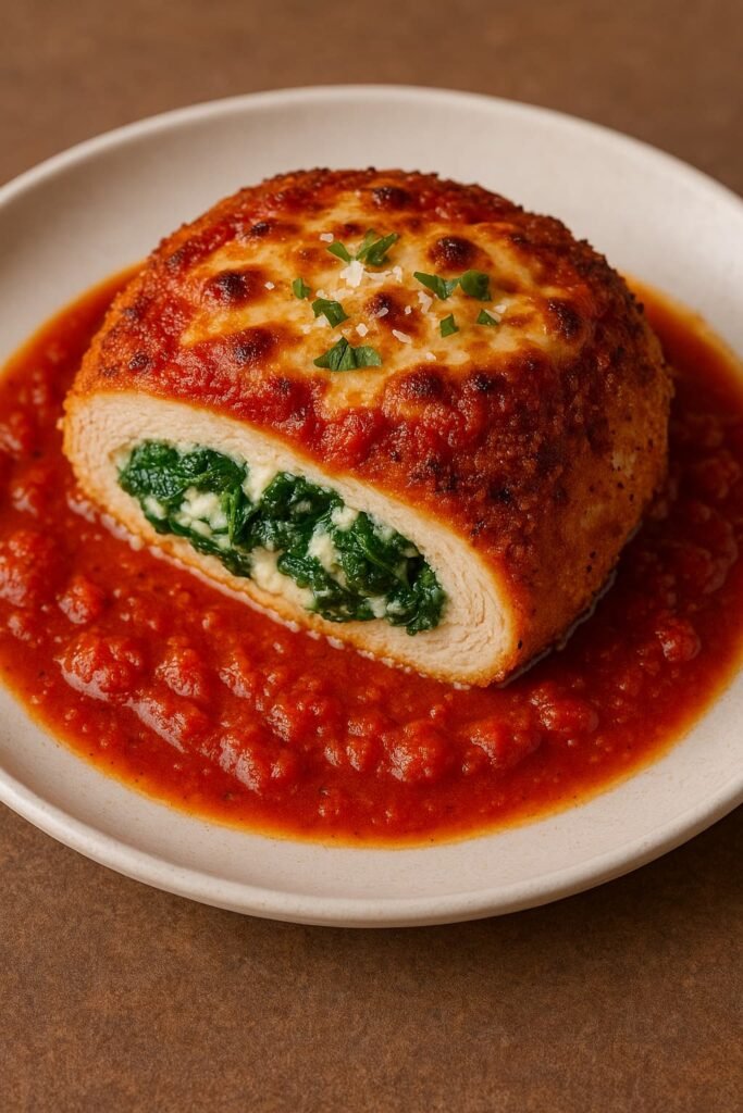 The juicy chicken breast acts as the perfect vessel for the spinach and ricotta stuffing, giving each bite a creamy, cheesy, and savory explosion. The classic parmesan crust adds crunch, while marinara sauce brings tanginess, tying everything together beautifully.