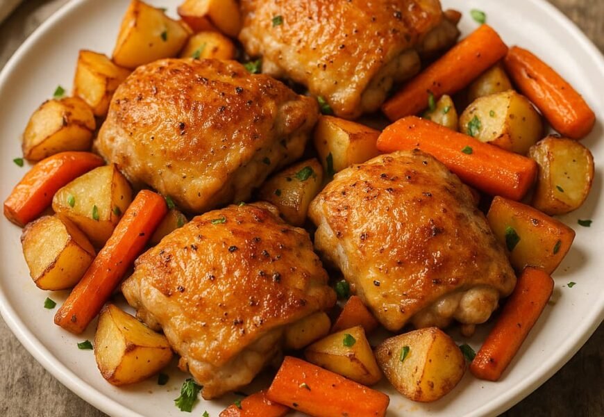 When it comes to comfort food recipes, few dishes beat crispy chicken thighs with roasted potatoes and carrots. This one-pan meal combines juicy, flavorful chicken with perfectly roasted vegetables, delivering a wholesome dinner that’s both easy to prepare and packed with nutrients. Whether you’re a busy parent, a home cook, or someone new to the kitchen, this recipe offers the ideal balance of simplicity, flavor, and nutrition.