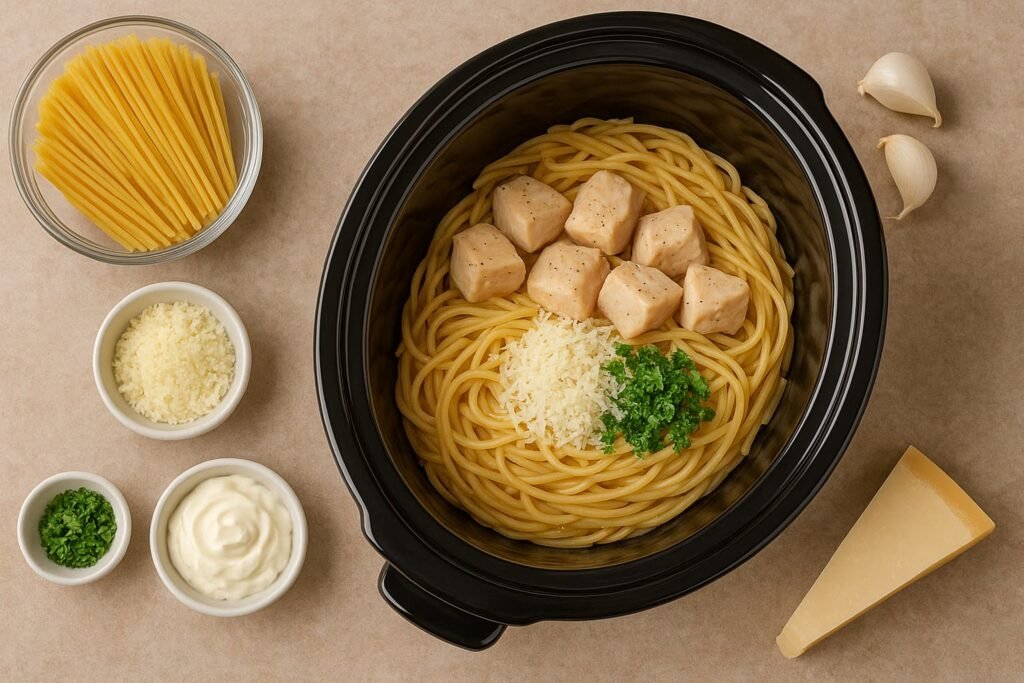 Here’s what goes into the classic Crock Pot Garlic Parmesan Chicken Pasta: