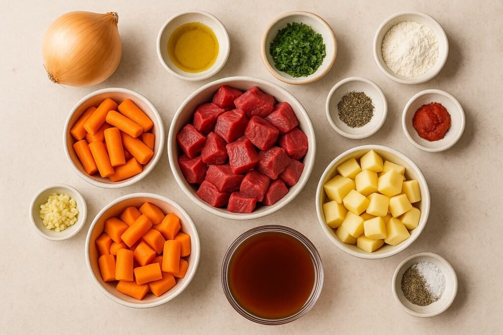 A great beef stew starts with fresh, high-quality ingredients. Here’s what you’ll need: