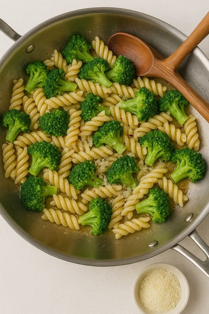 Toss the pasta with broccoli, garlic, and reserved pasta water to create a light sauce. Add grated Parmesan or nutritional yeast, and season with salt, pepper, and red pepper flakes.