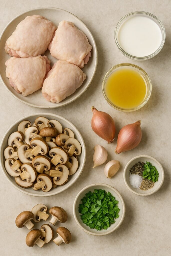 To create creamy mushroom chicken thighs, gather the following simple ingredients: