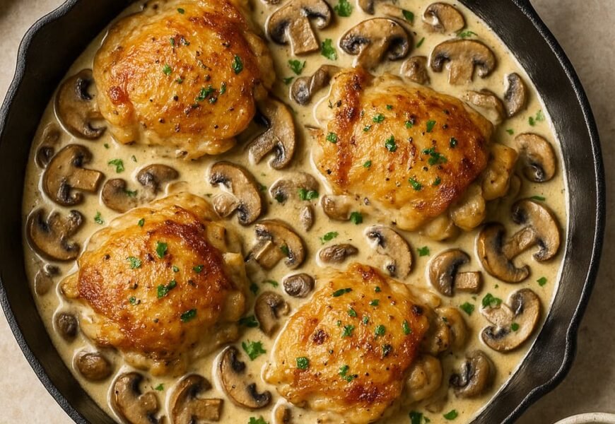 When it comes to easy weeknight dinners, few recipes can compete with the rich, savory flavors of one-pan creamy mushroom chicken thighs. This dish is the perfect balance of comfort and convenience — juicy chicken thighs seared to perfection, paired with a velvety mushroom cream sauce infused with garlic, fresh herbs, and Parmesan.