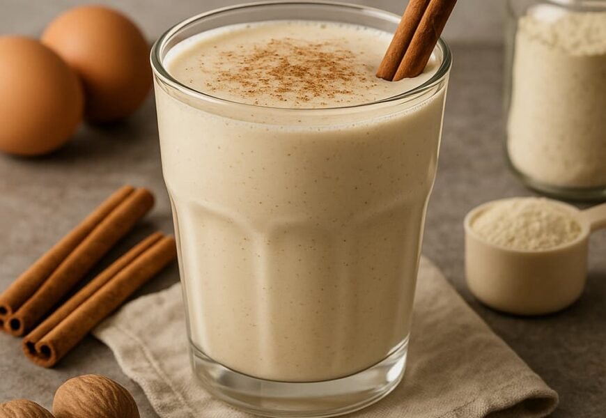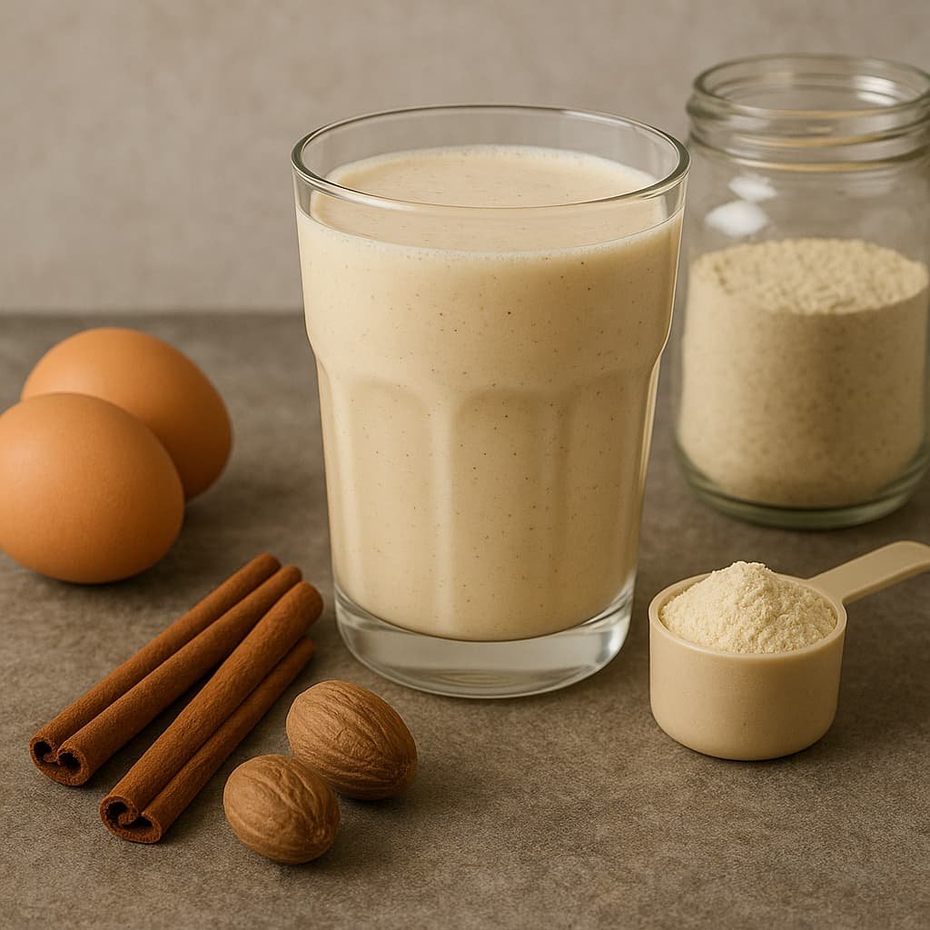 It blends traditional eggnog flavors (nutmeg, vanilla, cinnamon, that cozy holiday vibe) with protein-packed ingredients like whey protein, Greek yogurt, or almond butter. The result? A drink that tastes sinful but actually fuels your body.