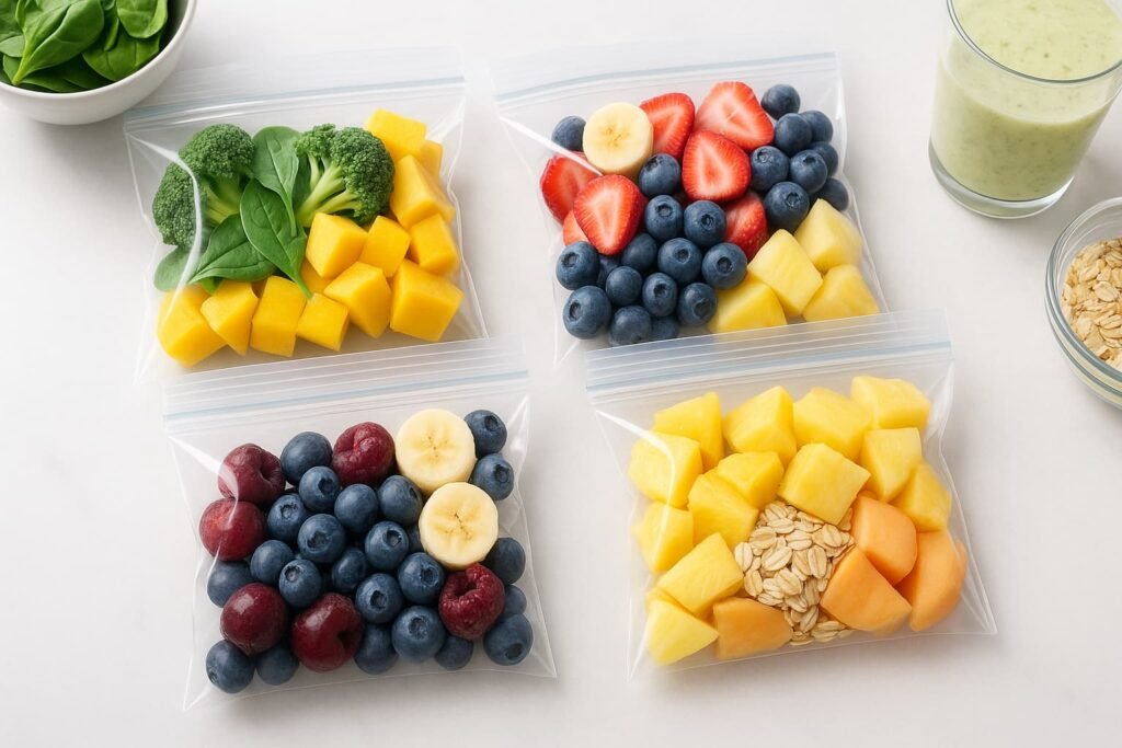 Smoothie freezer packs are pre-portioned bags of frozen fruits, vegetables, and add-ins stored in your freezer. When you’re ready for a smoothie, you just grab a pack, toss it into the blender, add liquid (like water, milk, or juice), and blend.
