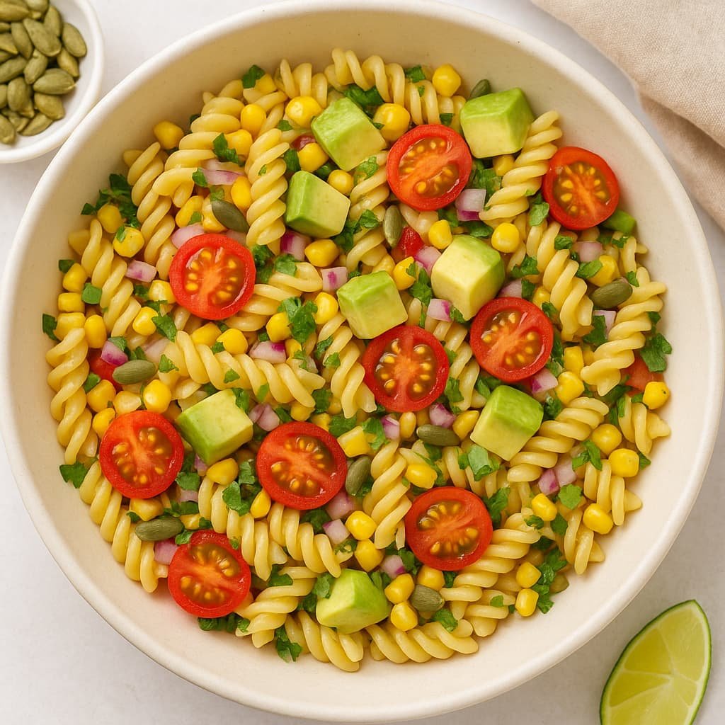 Whether you’re vegan or simply want a light and refreshing meal, this pasta salad will become one of your favorites. 🌽🥑